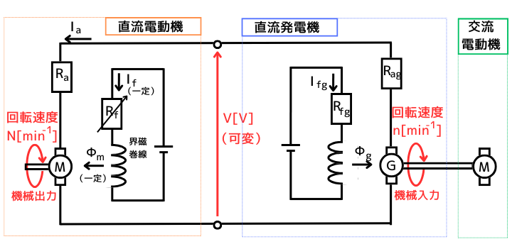 1台の電動機の速度制御をするために、2台追加で電動機を使用する狂気の構成をしていますが、直流電動機の電機子電圧の可変制御は、パワーエレクトロニクスが発展する前は難しく、このような大掛りな構成をしなければ実現が出来ませんでした。
