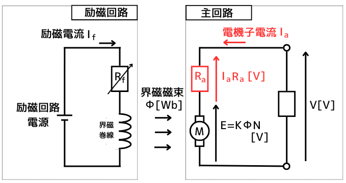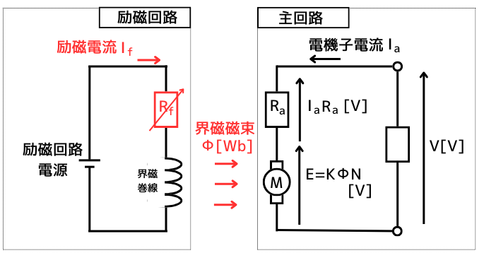 励磁電流を調整することが出来、励磁電流と比例関係にある、磁束\(\Phi\)を調節することができます。