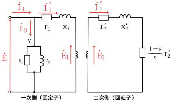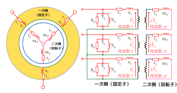 誘導電動機の等価回路は、一次回路(固定子)と二次回路(回転子)が磁気結合するため、変圧器の等価回路と同じ回路で表されます。