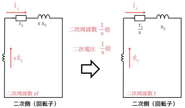 ただし、二次回路(回転子)が回転するため、すべりの影響を、その等価回路に反映させる必要があります。