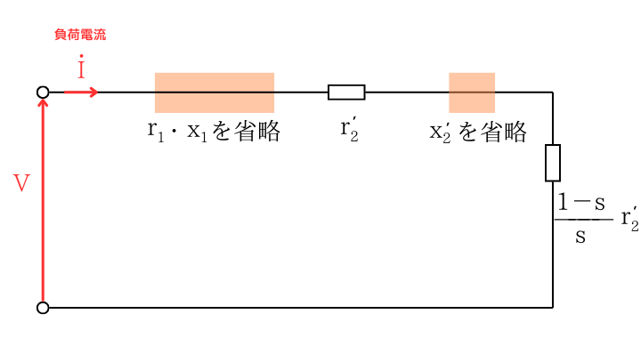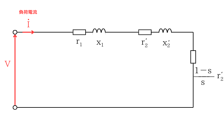 図1は、誘導電動機のL形等価回路です。L形等価回路のオーム法則から、負荷電流の大きさ\(I\)は、