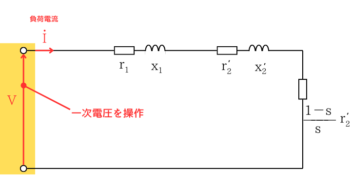 すべりの式(⑥式)と、負荷電流の式(②式)から一次電圧制御で電圧\(V\)を下げると、負荷電流\(I\)が増加することとなります。