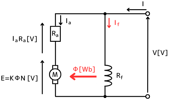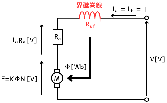 界磁巻線と主回路が直列接続されているため、界磁巻線にも負荷電流\(I_a\)が流れます。