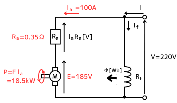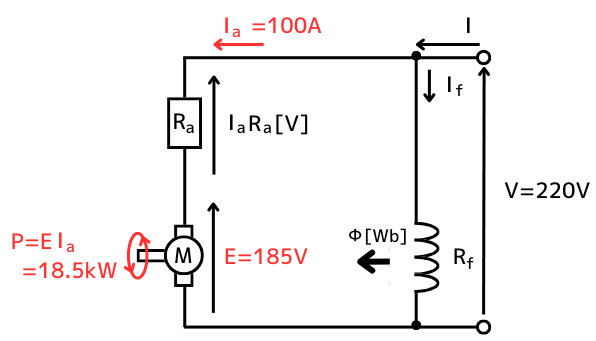 ある直流分巻電動機を端子電圧\(220V\)、電機子電流\(100A\)で運転したときの出力が\(18.5kW\)であった。