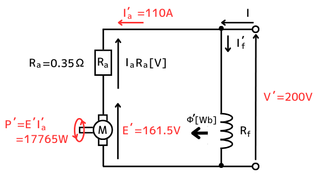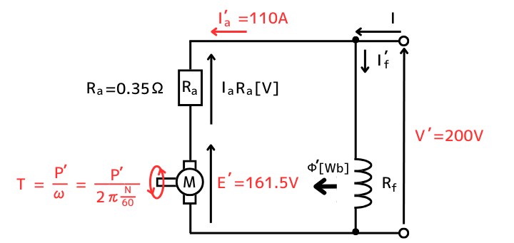 (3) 端子電圧と界磁抵抗を調整後の逆起電力\(E'[V]\)を求める