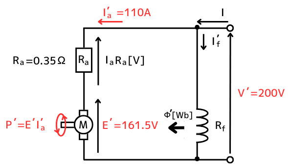 この電動機の端子電圧と界磁抵抗とを調節して、端子電圧\(200V\)、電機子電流\(110A\)、回転速度\(720min^{-1}\)で運転する。
