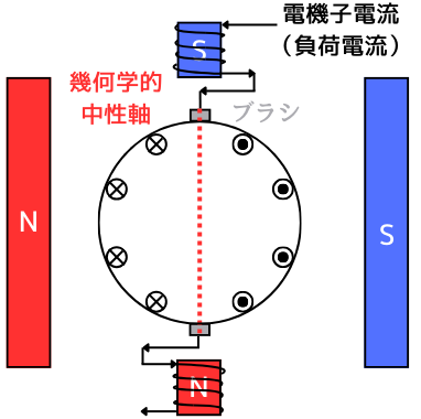 補極は、電機子反作用の原因である電機子電流の磁束に対して、打ち消す方向に磁束を発生させます。補極の巻線と、電機子巻線を直列に接続することで、補極は電機子電流の大きさに比例した磁束を発生することが出来ます。