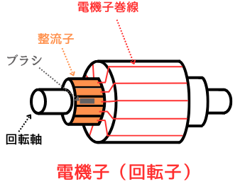 回転子が半回転すると、電機子巻線に働く電磁力の向きが逆になってしまうので、整流子で電機子巻線に流れる電流の向きを切り替えることで、一定の電磁力を得られるようにします。