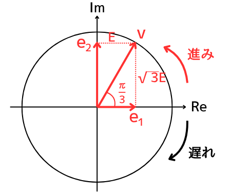 したがって、位相は\(e_1\)を基準として(イ) \(\frac{π}{3}\) [rad]の (ウ)進みとなります。