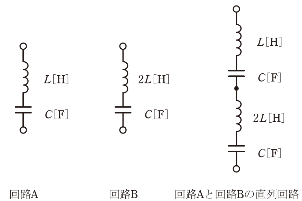 図のように、二つのLC直列共振回路A、Bがあり、それぞれの共振周波数が\(f_A[Hz]\)、\(f_B[Hz]\)である。これらA、Bをさらに直列に接続した場合、全体としての共振周波数が\(f_{AB}[Hz]\)になった。\(f_A[Hz]\)、\(f_B[Hz]\)及び\(f_{AB}[Hz]\)の大小関係として、正しいものを次の(1)~(5)のうちから一つ選べ。