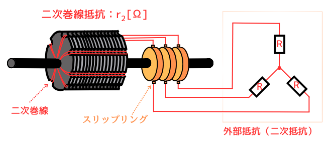その理由は、二次回路の巻線を(イ)スリップリングで引き出して抵抗を接続する必要があるためです。