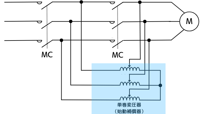 始動補償器による始動は、単巻変圧器を電源と電動機の間に挿入し、始動時の端子電圧を下げて始動します。