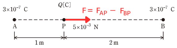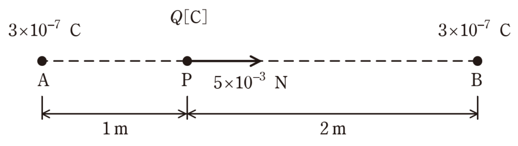 荷がある。A 点とB 点とを結ぶ線分上のA 点から \(1 m\) 離れたP 点に \(Q [C]\) の正の点電荷を置いたとき、その点電荷に B 点の方向に \(5×10^{-3} N\) の力が働いた。