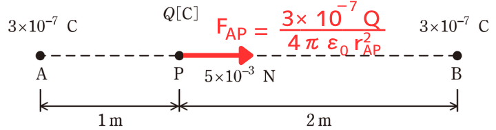 点Aの正の点電荷\(3×10^{-7}[C]\)が点Pの正の点電荷\(Q[C]\)に与える静電気力\(F_{AP}\)は、AP間の距離が\(r_{AP}=1[m]\)なので、