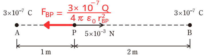 点Bの正の点電荷\(3×10^{-7}[C]\)が点Pの正の点電荷\(Q[C]\)に与える静電気力\(F_{BP}\)は、BP間の距離が\(r_{BP}=2[m]\)なので、