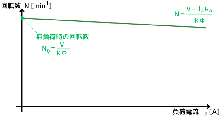 しかし、左図のグラフからわかるように、電機子電流\(I_a\)が大きくなっても回転速度はわずかにしか減少しません。