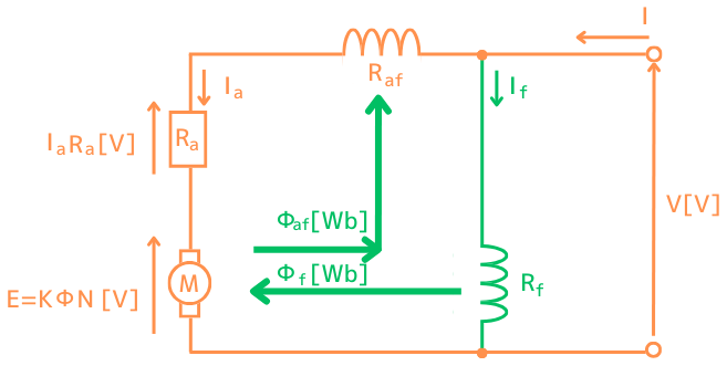直巻界磁巻線\(R_{af}\)と、分巻界磁巻線\(R_f\)の磁束が同じ方向を向いているときが和動複巻電動機です。逆向きのときが差動複巻電動機です。