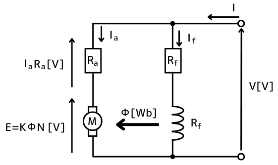 分巻電動機は、端子電圧を一定として機械的な負荷を増加したとき、電機子電流が増加し、回転速度は、わずかに減少するがほぼ一定である。