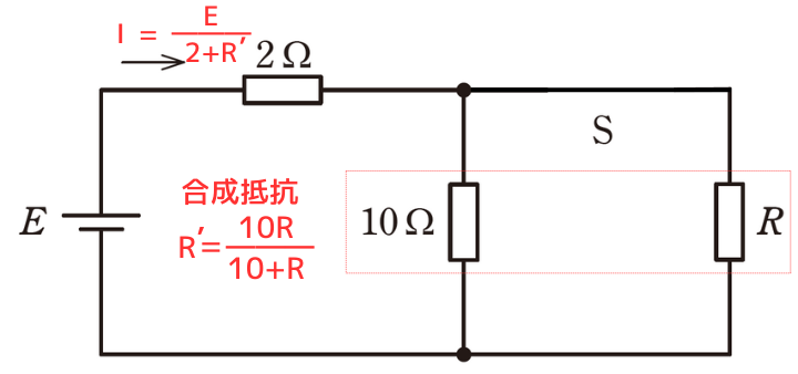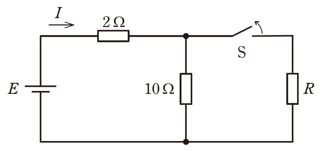 スイッチSを閉じたときの10ΩとR[Ω]の並列接続の抵抗の合成抵抗値を\(R’\)とすると、
