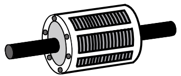 かご形回転子は、積層鉄心に、両端の短絡環(エンドリング)と、多数の導体棒(バー)を接続した、かご形構造となっています。