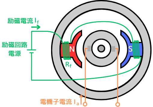 他励式直流電動機は、左図のように、励磁回路の電源が主回路の電源と別々になっている直流電動機です。