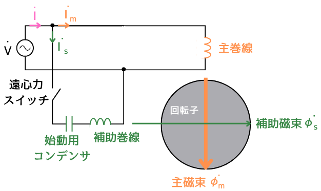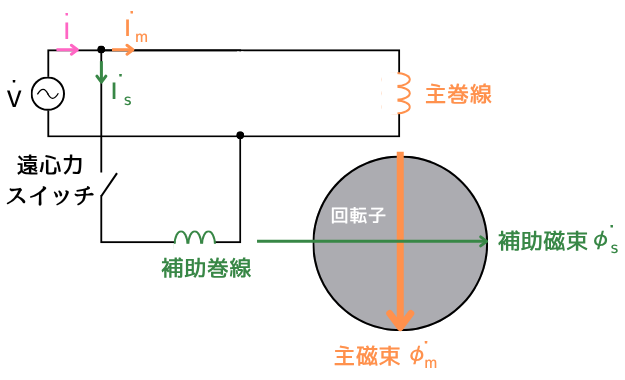 擬似的に強い回転磁界が作られ、回転子に誘導電流が生じて始動トルクが発生し、モーターが回転を始める。 - 回転数が同期速度の70~80%程度まで達すると、遠心力スイッチが補助巻線を回路から切り離す。