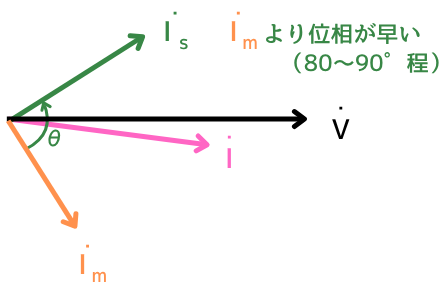 - 主巻線電流\(\dot{I_m}\)が主磁束\(\dot{φ_m}\)を発生する。
