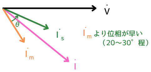- 補助巻線電流\(\dot{I_s}\)は抵抗が大きくリアクタンスが小さいため、主巻線よりも位相が20°~30°程度進む。そのため、\(\dot{φ_m}\)よりも位相が進んでいる\(\dot{φ_s}\)を発生する。