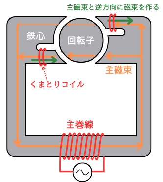 くま取りコイルが磁束の変化を、部分的に遅らせることで、正相回転する磁界と逆相回転する磁界の釣り合いを崩すことができるので、静止状態から始動することができるようになります。