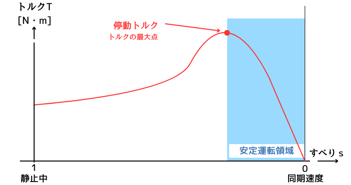 負荷が停動トルクよりも小さな場合は、負荷と出力トルクが釣り合うすべり\(s\)の点で安定します。