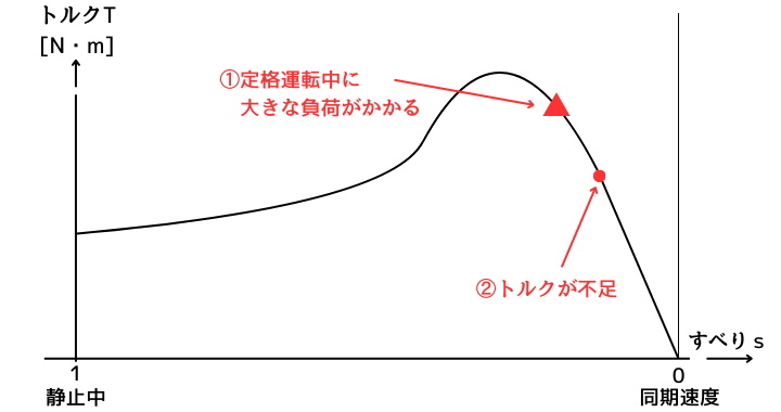 誘導電動機が運転している最中に大きな負荷がかかると、トルクが不足するため減速していきます。(すべりは増加)