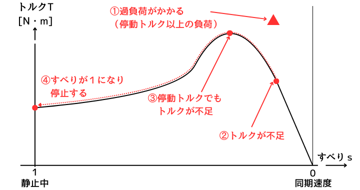 停動トルクを上回る過負荷がかかったとき、回転する力が足りないため、誘導電動機は最終的に停止してしまいます。