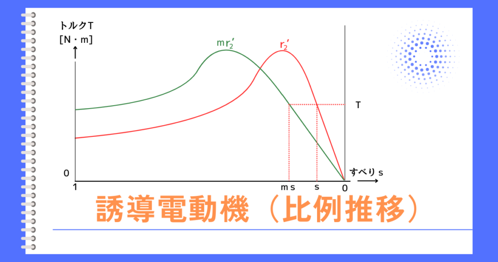 そのため、巻線形誘導機で比例推移のために外部抵抗を変化させても、停動トルクは維持したまますべりートルク特性のグラフは変化します。