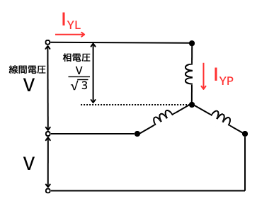線間電圧\(V[V]\)のとき、相電圧は\(\frac{V}{\sqrt{3}}\)なので、相電流\(I_{YP}[A]\)は、